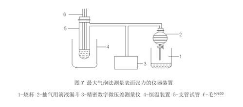 最大压力气泡法的原理是将毛细管端浸入液中,通过增加内压便产生气泡,然后从管端成长的气泡的最大泡压可求出液体的表面张力。 最大压力气泡法使用的仪器主要为烧杯、抽气用滴液漏斗、精密数字微压差测量仪、恒温装置 、支管试管、毛细管等。检测步骤当然也先制样,然后清洗仪器,之后检验仪器,调节毛细管或液面高度,使毛细管口与水面相切。打开活塞抽气,调节抽气速度,使气泡由毛细管尖端成单泡出,且每个气泡形成的时间约为 6s-10s。在形成气泡的过程中,液面半径经历:大→小→大,同时压力差计指示值的绝对值经历:小→大→小的过程,记录下绝对值最大的压力差三次,取其平均值。最大压力气泡法每次测量前应注意:一定要用待测溶液清洗支管试管和毛细管,并振荡洗涤。