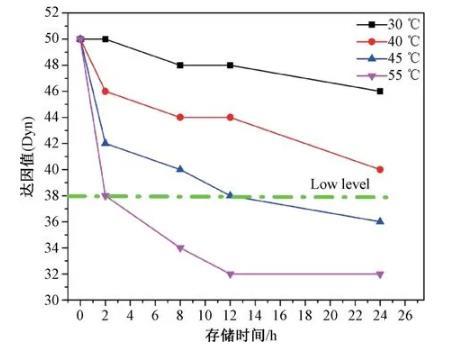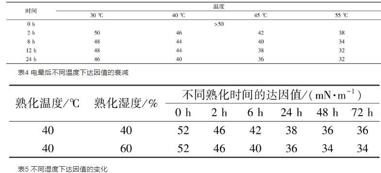 随着保存时间的增长,背板的达因值也随着逐渐降低。在低温30℃下保存1d后达因值仍能达到48 mN/m,湿度越低,达因值下降越缓慢。温度越高湿度越大,达因值下降越快。