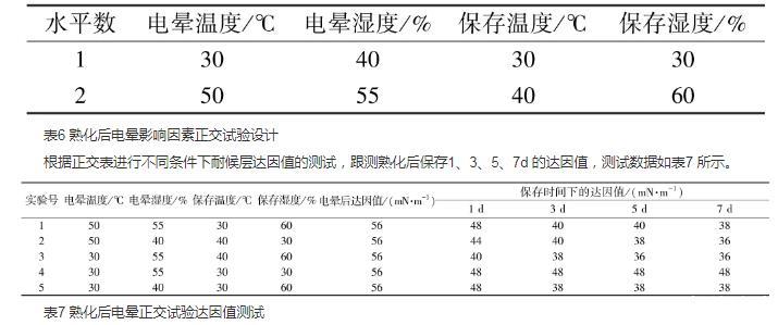 本文通过JMP软件定制熟化前后电晕正交试验设计,发现熟化温度影响最显著,熟化环境的湿度对耐候层表面张力影响第二显著,反应程度第三显著,电晕温度无明显影响。在40℃条件下,对熟化湿度进行单因素分析,控制熟化湿度低于40%,基本上能使耐候层表面张力达到38 mN/m。熟化后电晕与熟化前电晕相比,在相同的保存时间内,熟化后电晕达因值较大。