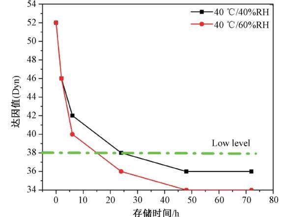 控制熟化温度40℃,考察不同熟化湿度40%、60%下储存不同时间耐候层达因值的变化规律,如图4所示。对比两种湿度下达因值的下降趋势,60%的湿度环境达因值下降较快,在约24 h后达因值即已下降至38 mN/m以下。40%的湿度环境可维持38 mN/m的水平至少24 h。因此为保证耐候层达因值不低于38 mN/m,需严格控制所处环境湿度小于40%RH。
