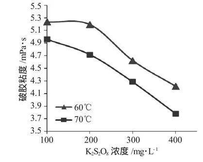 表2结果表明,温度为70℃时,随着破胶时间增加,K2S2O8作为破胶剂的破胶液破胶粘度和表面张力是逐渐降低,当K2S2O8加入量为100mg·L-1时,4h后破胶液粘度为4.9572mPa·s、8.71mN·m-1,当K2S2O8加入量为400mg·L-1,2.3h破胶后破胶液粘度为4.516mPa·s、8.61mN·m-1。