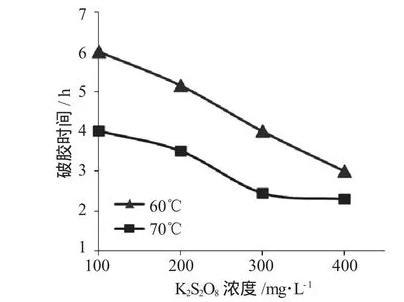 (1)在实验温度60℃下,通过对比过硫酸盐浓度不同,浓度越高,破胶时间缩短,破胶液粘度和表面张力逐渐降低。