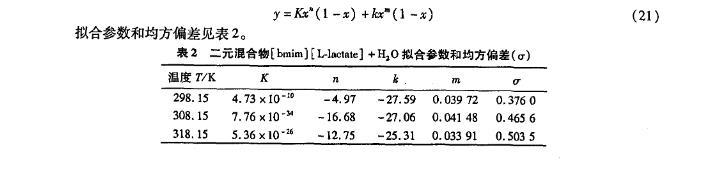 表2二元混合物[bmim][L-lactate]+H2 O拟合参数和均方偏差(σ)