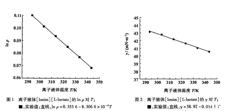 在293.15~343.15 K温度范围内实验测得的离子液体[bmim][L-lactate]的表面张力值随温度的升高而减小(图2),并且得到表面张力的经验方程: