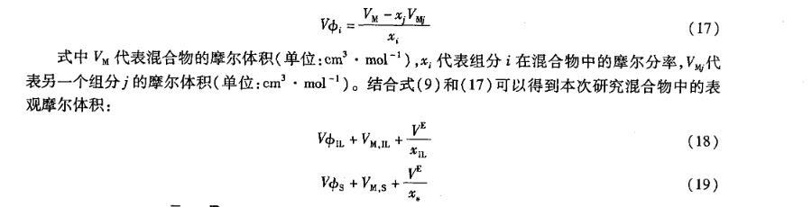 二元混合物中组份i的表观摩尔体积Vφi可由下式计算得到: