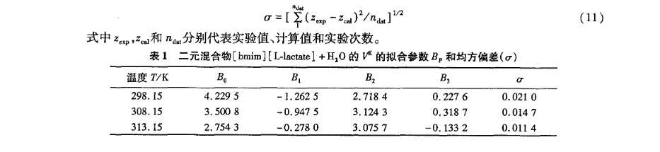 表1二元混合物[bmim][L-lactate]+H2O的V E的拟合参数BP和均方偏差(σ)