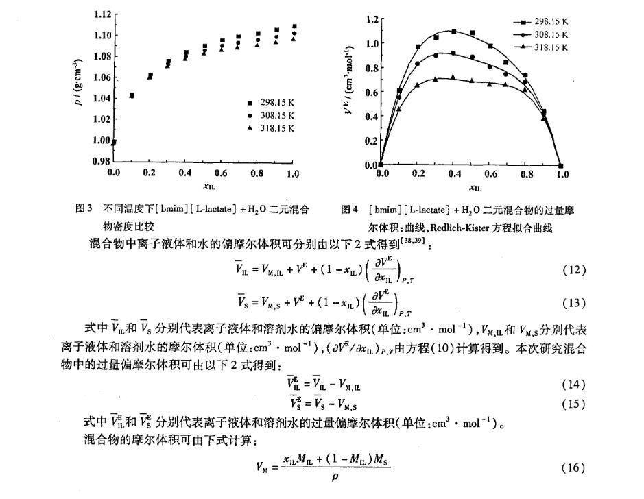式中VM为混合物的摩尔体积(单位:cm3·mol-1),MIL和MS分别为离子液体和溶剂水的摩尔质量(单位:g·mol-1),xIL为离子液体在混合物中的摩尔分率,ρ为混合物的密度(单位:g·cm-3)。