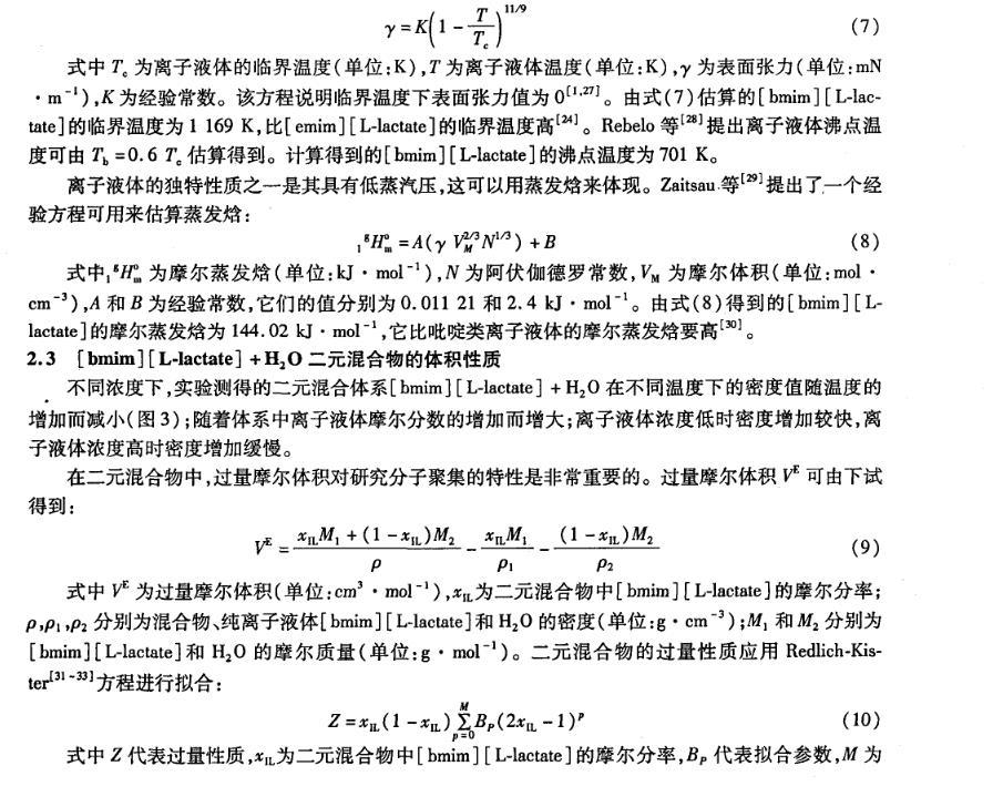 离子液体的临界温度(critical temperatures,Tc)是其重要的物理化学性质之一,然而离子液体本身的性质使得临界温度的实验值很难获得。因此,许多研究小组应用Guggenheim经验方程来推测离子液体的临界温度。该经验方程的形式为: