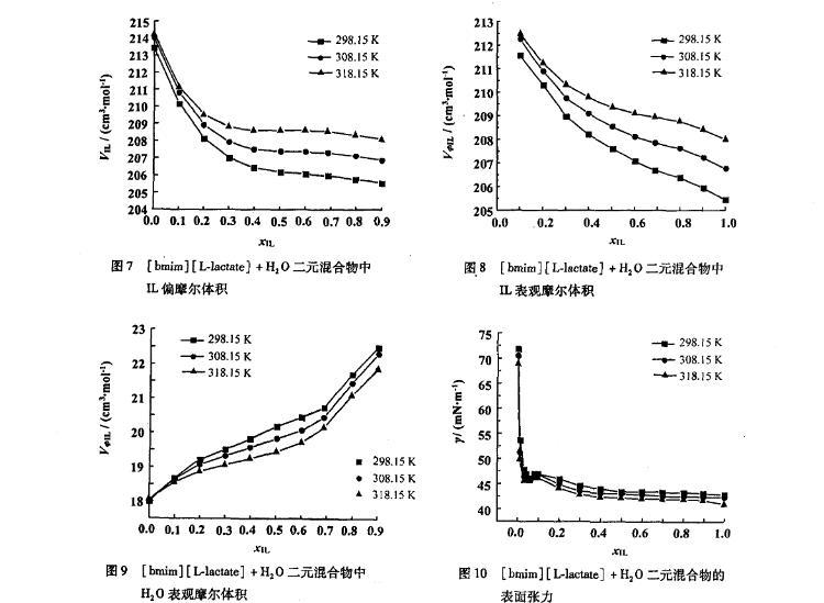 图8[bmim][L-lactate]+H2 O二元混合物中IL表观摩尔体积