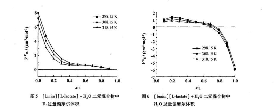 图5[bmim][L-lactate]+H2 O二元混合物中IL过量偏摩尔体积
