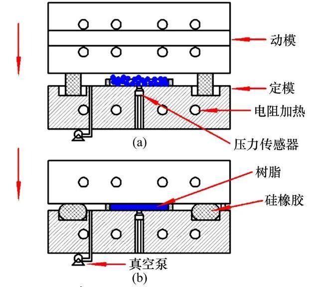 测定薄板分别由2种材料CBT500和PP制成,用于一定温度下不同材料液滴在相应薄板上静态接触角的测量。采用抽真空热压工艺制备光滑薄板,成型工艺参数如表1所示,具体过程为:采用信易SCD−20μ/30H干燥机对CBT500和PP颗粒进行干燥,干燥温度、时间分别为80℃和24 h。采用HH−138的精密烤箱对干燥后CBT500和PP颗粒分别进行预加热,加热温度分别为140℃和160℃,加热时间均为0.5 h。将预加热CBT500和PP颗粒分别倒入温度为130℃和150℃的模具中,采取抽真空热压工艺制备CBT500和PP光滑薄板。抽真空热压工艺包括6个阶段:1)动模降至密封圈;2)抽真空;3)施压;4)保压;5)冷却;6)开模取件。为获得良好的密闭空间,动模应迅速下降至密封圈并微压,如图2(a)所示。抽真空后,施加压力将CBT500和PP颗粒压实,制成相应光滑薄板,如图2(b)所示。
