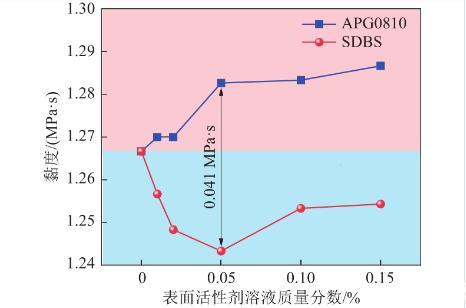在质量分数为0.05%时两种表面活性剂溶液黏度相差0.041 MPa·s,达到最大值,这是由于在该质量分数下SDBS溶液未形成胶束,且离子之间斥力最大,而APG0810溶液开始形成胶束,溶液内分子间碰撞概率变大。