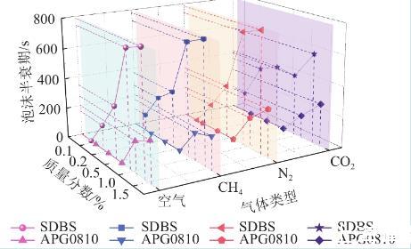 图9为不同气体注入溶液中稳泡性的变化规律。随着溶液质量分数升高,泡沫稳定性逐渐增强。在溶液质量分数相同时,SDBS溶液泡沫稳定性均优于APG0810。