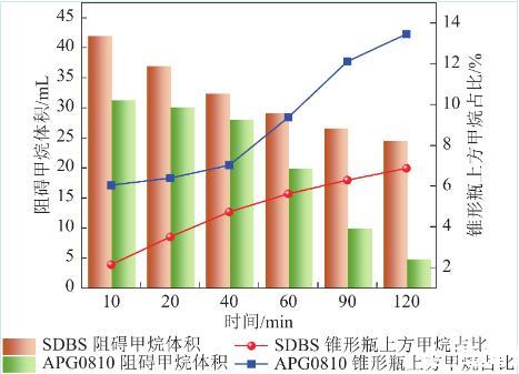 表面活性剂泡沫对氮气缓释作用结果如图11所示。相同质量分数下,SDBS溶液对氮气的缓释效应优于APG0810,质量分数为0.15%时,SDBS和APG0810溶液泡沫阻碍氮气体积分别为49.102 mL和37.042 mL。