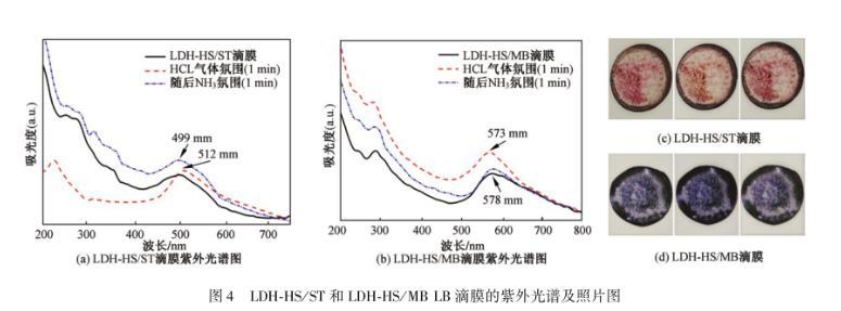 图3(a)和3(b)分别显示的是LDH-HS/ST和LDH-HS/MB多层LB复合膜沉积在石英底片上测得的UV光谱,以及经1 min HCl气体氛围处理后和1 min NH3气体氛围处理后的UV变化光谱图。图3(c)和3(d)对应展示了LDH-HS/ST和LDH-HS/MB复合膜酸碱气体氛围下石英片颜色变化前后对比图。