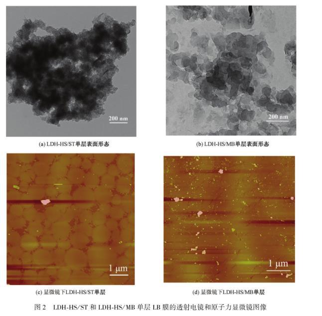 图2 LDH-HS/ST和LDH-HS/MB单层LB膜的透射电镜和原子力显微镜图像