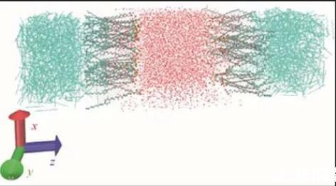 在进行分子动力学模拟之前构建出合理的力场是极为重要的工作。本文通过Autom-ated Topology Builder(ATB)and repository生成的GROMOS系列力场参数,利用现有的数据库以及量子化学进行计算,同时它可以充分考虑到分子中的对称结构,使其反映出的分子性质及参数更为精确。但ATB只能处理原子数小于40的分子,对于分子数大于40的分子结构需进行拆分。在获取准确的电荷及键参数之后利用packmol程序定向排列分子将其堆砌成立方体结构。此外,本文选取的油-水界面需使表面活性剂平均分布在水相两侧,亲水基靠近水相,疏水基靠向油相。图2为初始状态下体系截图,其中中间红色部分为水分子,左右两侧蓝色部分为癸烷分子,油水中间即OPES分子。