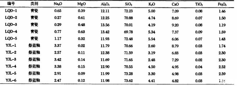 表2宋代龙泉青瓷釉和元代景德镇元代祭蓝釉的主、次量元素组成