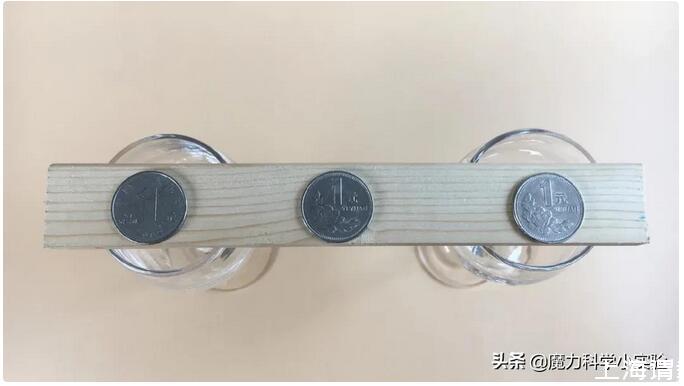 1.用两只玻璃杯架起小木片,三枚硬币并排摆放在小木片上。
