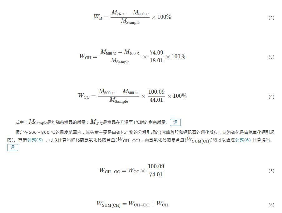 假定在600~800℃的温度范围内,热失重主要是由碳化产物的分解引起的(忽略凝胶和钙矾石的碳化反应,认为碳化是由氢氧化钙引起的)。根据公式(5),可以计算出碳化前氢氧化钙的含量,而氢氧化钙的总含量则可以通过公式(6)计算得出。