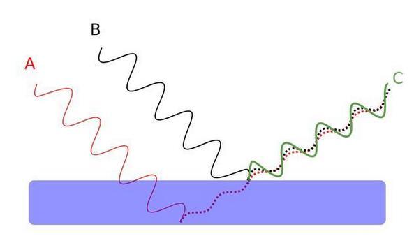 所谓薄膜干涉,就是一束光照射于薄膜,由于折射率不同,光会被薄膜的上界面与下界面分别反射,因相互干涉而形成新的光,这现象称为薄膜干涉[2]。新的光是上下界面反射光的叠加,两个界面的反射光可能干涉相长(强度增加)或干涉相消(强度减小),这取决于它们的相位关系。
