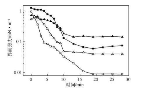 从图8可以看出,随C14DEA浓度增加,体系油水界面张力大幅降低,达到最低界面张力时间缩短,当质量分数大于0.1%时,油水界面张力能达10−3mN/m数量级,与CnDEA复配规律一致。