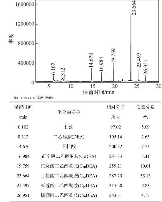 取一定量的GYD,用甲醇作溶剂,将其稀释至约0.4%的质量分数后,进行GC-MS全扫描分析,得总离子流色谱图见图1。用气相色谱数据处理系统,以峰面积归一法测得其中各组分的相对质量分数,分析结果见表2。从表2可以看出,GYD是一种组成复杂的烷基醇酰胺混合物,主要包括不同碳数脂肪酸二乙醇酰胺和剩余原料甘油、二乙醇胺、月桂酸等。其中,月桂酸二乙醇酰胺相对含量最高为55.13%。