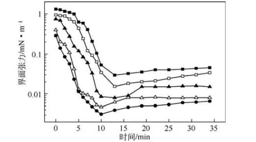 图7不同助剂对复配体系油/水动态界面张力的影响