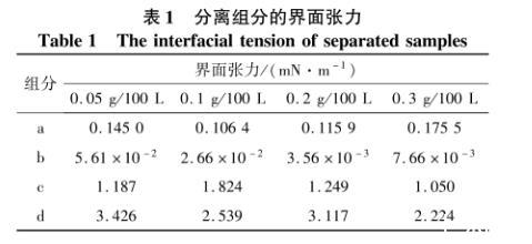 由表1可知,组分b质量浓度达到0.2 g/100 L时,即可使该油/水体系的界面张力降至超低(低于10-3mN/m),而其他组分即使在较高质量浓度的情况下,依然不能使其油/水体系的界面张力达到超低,其中组分d在降低该体系界面张力方面的能力最差。说明石油磺酸盐活性组分的组成差异是影响系列石油磺酸盐具有不同界面活性的主要因素。