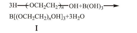 将0.12 mol聚乙二醇和0.04 mol硼酸依次装入带有搅拌器、分水器、回流冷凝器的三口烧瓶中,并连接减压装置。加热至120℃,在负压下进行反应至出水量不变,酯化过程如下所示: