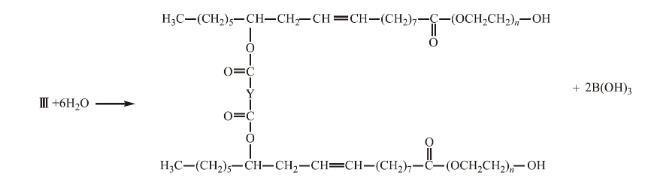 待反应液冷却至50℃,向反应液中加入0.12 mol蓖麻油酸与催化剂对甲基苯磺酸(PTS的质量为蓖麻油、聚乙二酸与硼酸总质量的1%),升温至140℃,在负压下进行反应,至体系酸值不变,酯化过程如下所示: