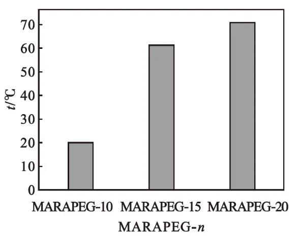 马来酰蓖麻油酸聚乙二醇(n=10、15、20)酯的浊点如图6所示。由图6可知:产物的浊点范围为20——71℃。随着聚乙二醇聚合度的增加,产品的浊点逐渐升高。聚乙二醇聚合度越大,聚乙二醇醚键中的氧原子与水中氢原子形成的氢键越多,产品在水中的溶解性能越好。