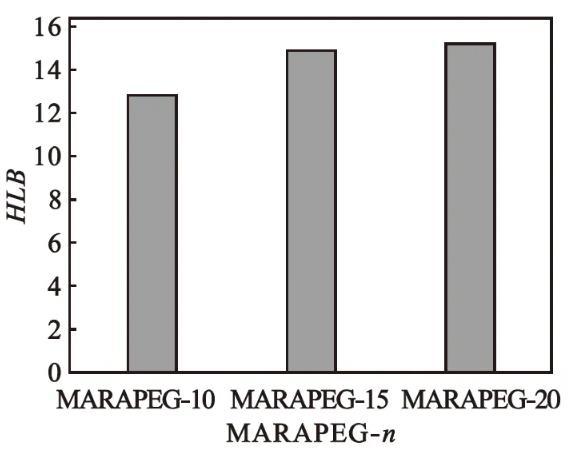 图3马来酰蓖麻油酸聚乙二醇(n=10、15、20)酯的HLB值