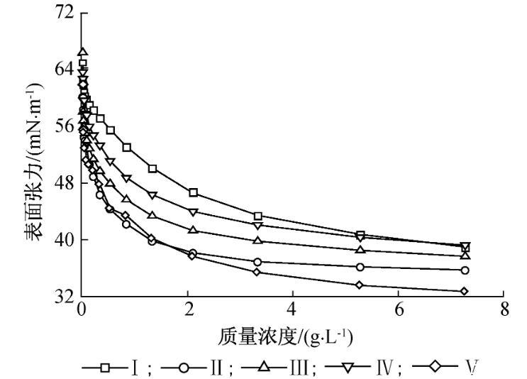 由图3可见,25℃时表面活性剂的表面张力随着溶液质量浓度的增大而减小。当浓度达到一定值时,溶液表面张力降到最低值,此时再增加质量浓度,溶液表面张力几乎不变。表面活性剂的CMC值和γCMC具体见表2。由表2可知,5种表面活性剂Ⅰ、Ⅱ、Ⅲ、Ⅳ和Ⅴ的CMC值分别为6.5、2.1、2.7、3.3和5.5 g/L,对应的γCMC分别为42.0、38.2、39.8、42.1和33.7 mN/m。CMC和γCMC随着聚乙二醇相对分子质量的增大呈现先减小后增大的趋势,化合物Ⅱ的CMC值和γCMC最佳。