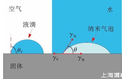 纳米气泡是固-液界面上形成的直径或高度为纳米尺度的气泡。近二十年来,纳米气泡引起越来越多学者的关注,已经成为表面科学领域的研究热点之一。纳米气泡的特征、形成方法、影响因素及潜在应用等已经被广泛且较深入的研究。纳米气泡的稳定性及导致其反常小的接触角(气相)的原因仍然是未解决的问题。为此,笔者对固-液界面纳米气泡的接触角进行研究。纳米气泡接触角的影响分析。实验研究发现,纳米气泡的接触角远小于其宏观接触角,文中纳米气泡的接触角是指其气相接触角。如图1所示,对于聚苯乙烯表面,宏观液滴的液相接触角约为95°,其气相接触角则约为75°,实验中聚苯乙烯表面上纳米气泡的接触角约为2.2°~31.0°,远远小于其宏观接触角。根据拉普拉斯公式,气泡内外的压力差为