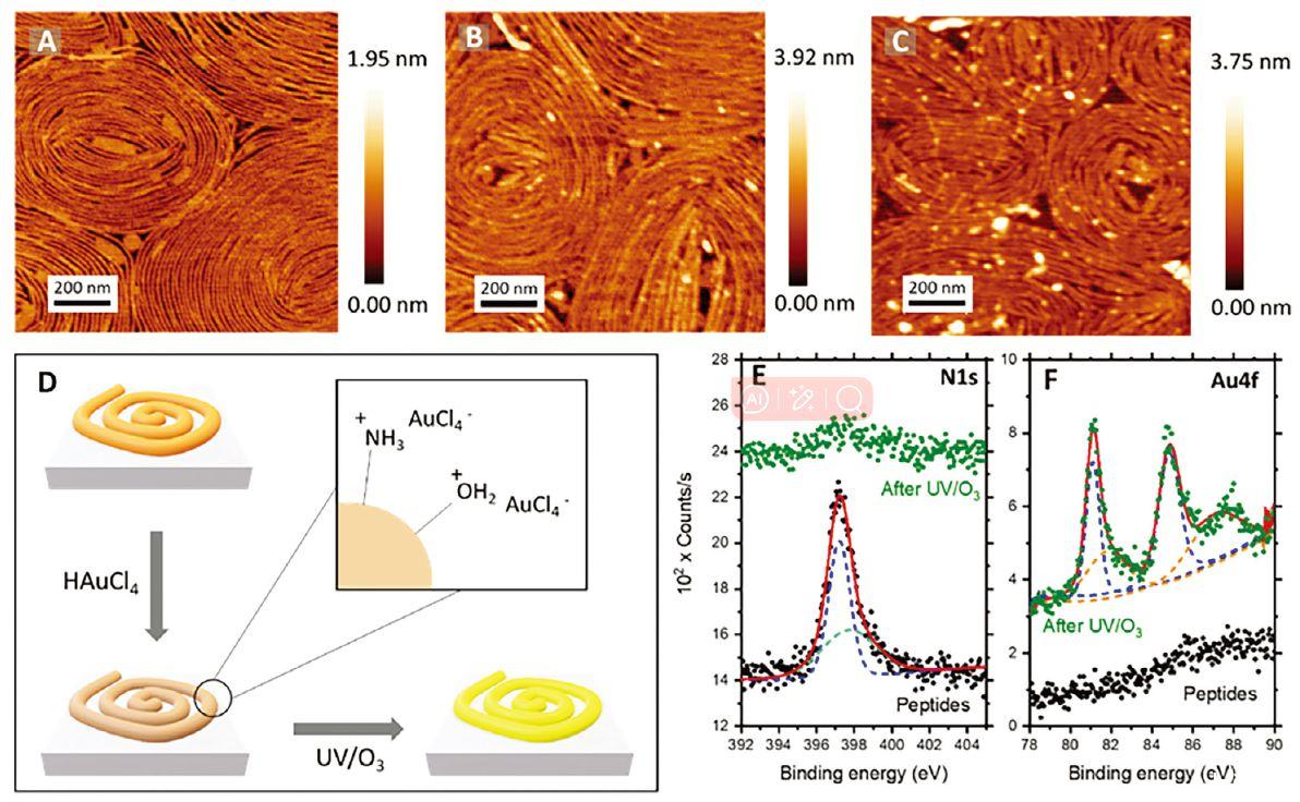 图5、A)原始FP2肽在20 mN m-1表面压力下在云母基底上的AFM显微照片,B)浸入HAuCl4溶液30分钟后的照片,以及C)在随后的UV/O3降解处理后的照片。D)示意图显示了肽纤维和金前体盐在水溶液中的相互作用。原始FP2肽的E)N 1s和F)Au 4f(黑点)以及无机掺入和UV/O 3降解后(绿点)的高分辨率XPS。