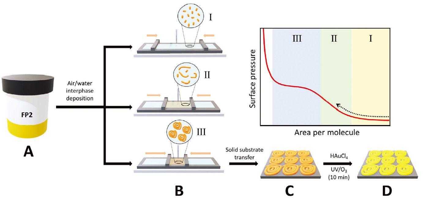 图1、实验方法的示意图总结。A)将肽溶液制备成DMF。B)在空气-水界面处沉积并使用LB装置进行压缩。C)转移到云母基材上。D)用金属盐选择性浸渍并用UV/O3去除肽。