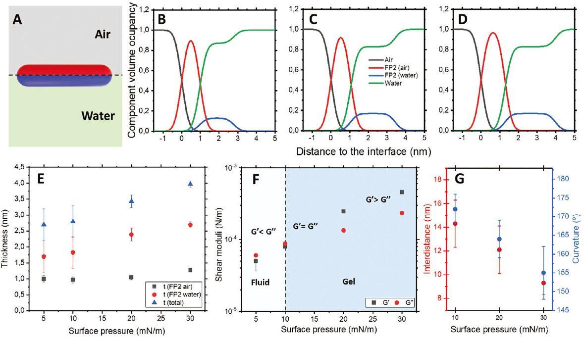 图4、A)用于拟合NR数据的模型示意图。B)10、C)20和D)30 mN m-1处界面的密度分布。E)通过NR获得的纤维的总厚度。F)界面剪切流变测量。G)通过分析AFM图像获得纤维的间距和曲率。