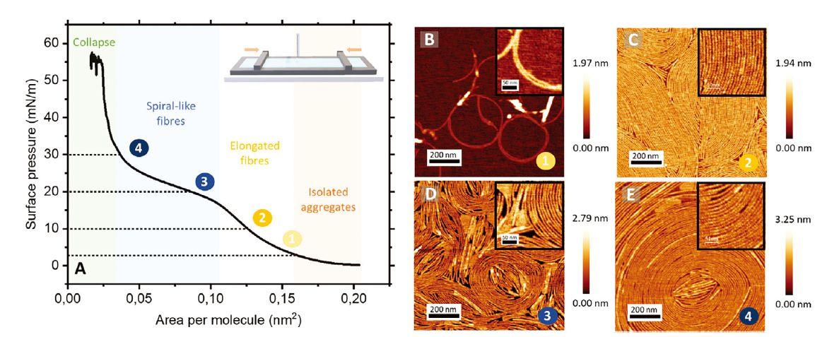 图3、A)在空气/水界面上铺展的FP2肽的压缩等温线π–A以及在3、10、20和30 mN m−1下获得的LB肽膜的AFM显微照片(分别为B、C、D和E))。
