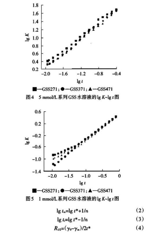 测得的DST数据经公式(1)处理后,令lgK表示lg[(γ0-γt)/(γt-γm)],以lgK对lgt作图,结果见图4~5。从直线的斜率与截距可以得到DST的特性参数n与t*值,并可根据公式(2)~(4)进一步得到诱导区结束时间ti、介平衡开始时间tm及t1/2时表面张力下降速率R1/2,结果见表2。