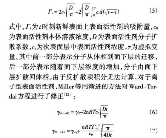 表面活性剂分子在新鲜表面上的吸附分两步进行:(1)分子从本体溶液到次表面的迁移;(2)分子在次表面和表面间的吸附平衡。在动态吸附模型的基础上提出了两种主要的动态吸附机理:扩散控制吸附、混合动力控制吸附。