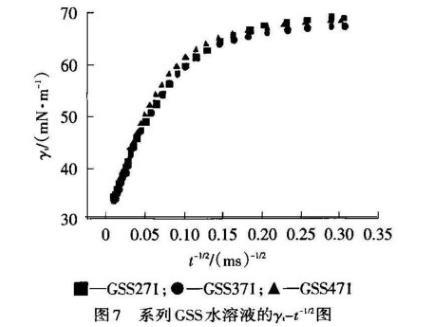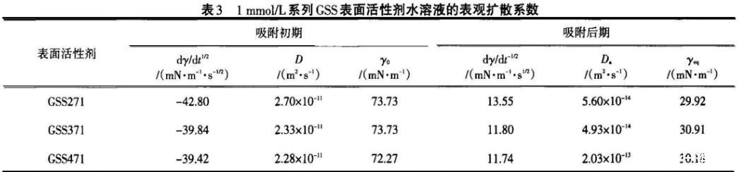 在吸附初期,GSS271的扩散系数最大,表明较容易扩散到次表面,这与在相同浓度下Rosen模型处理的n值最小吻合;在吸附后期,GSS471的扩散系数最大,这与其柔性连接链扭曲变形而在表面定向排列紧密相关,且与Rosen模型处理的t*值最大吻合。