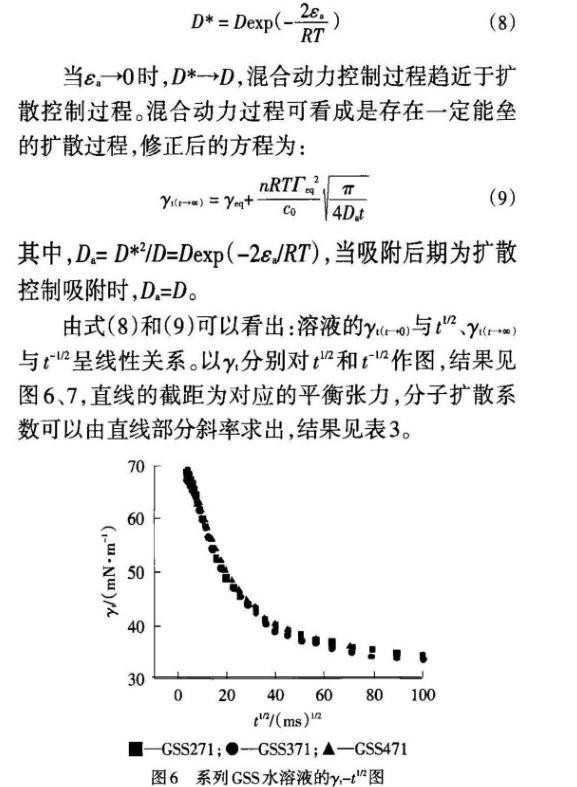 从表3可知,吸附初期GSS的扩散系数较吸附后期大2~3个数量级。表明GSS分子自本体溶液扩散到次表面的速度远大于在气液界面与次表面之间的交换速度,因为在吸附初期(t→0),新鲜表面不存在吸附势垒,属扩散控制吸附;吸附后期(t→∞),在气液界面吸附的GSS分子由于相互作用产生的位能垒、离子头基间的静电斥力以及分子的定位重排等共同作用导致了混合动力扩散控制。