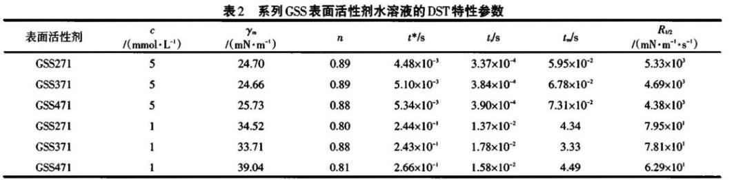 以GSS271为例,浓度越高,表面活性剂分子的扩散推动力越大,于气液界面吸附越快,DST下降越显著,因而诱导区结束的时间越早,越易达到介平衡,这与γm、ti、tm较小吻合;t*值随浓度增大而减小,表明吸附后期势垒随浓度增大而增大,因为浓度较高时,更多的GSS271分子吸附于表面,由于空间位阻、分子间静电斥力的影响,阻碍了新的GSS271分子吸附,吸附势垒变大。浓度高时,R1/2大,动态表面活性好。