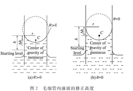 (1)接触角与修正高度对毛细管内半径的影响。测定无水乙醇与毛细管内壁的接触角(θ)。采用式(2)标定毛细管的内半径(r),比较标定内半径与生产标号的差异。
