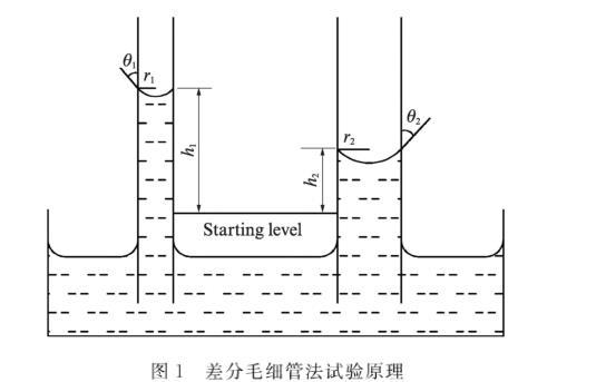 基于上述分析,本文基于差分毛细管法,推导出沥青表面张力计算公式,设计了差分毛细管法测试沥青表面张力的装置,标定了毛细管的内半径,分析了毛细管内半径、接触角、修正高度等因素对高温液态沥青表面张力测试结果的影响,改进了差分毛细管法并对其有效性进行了验证,以期推动高温液态沥青表面张力的测试技术的进展。