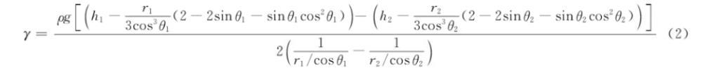 式中:ρ为试验温度下液体的密度;g为当地重力加速度;h1、h2为自同一水平面起,差分组合的毛细管内凹液面上缘的最大上升高度,因表面张力计算仅需同质异径毛细管内液面的高度差,图1中的起始平面可在管外沥青液面与毛细管上升高度间指定;θ1、θ2为毛细管内凹液面拟合为球冠状之后的接触角;r1、r2为差分组合的毛细管内半径大小。