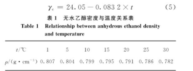 毛细管的实际内半径r与生产标号NRI有一定差异,需进行标定。文中毛细管内半径在0.08——0.50mm范围内,难以直接测定。利用式(2),选择无水乙醇作为标定液,内半径较粗、可测的毛细管作为基准管,反向标定较细毛细管的内半径。标定过程为:(1)通过电荷耦合器件(CCD)相机拍摄,并获取基准管的内半径。(2)使用相机拍摄毛细管内液面上升高度,以及无水乙醇与管内壁的接触角;(3)记录试验温度t.根据无水乙醇的表面张力计算公式和温度~密度特性表获得其表面张力γe与密度ρ,见式(5)和表1.(4)将上述参数代入式(2),得到毛细管的内半径值。