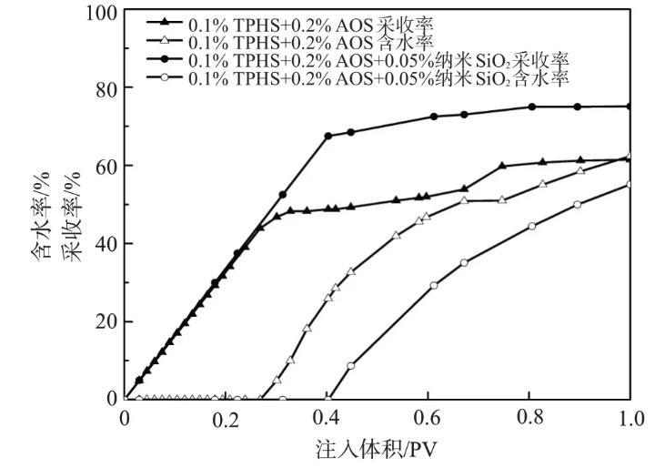 少量纳米SiO2颗粒与TPHS、AOS复配即可产生润湿协同作用,提高渗吸速率和采收率,并能形成乳液稳定油墙,延长无水采油期。