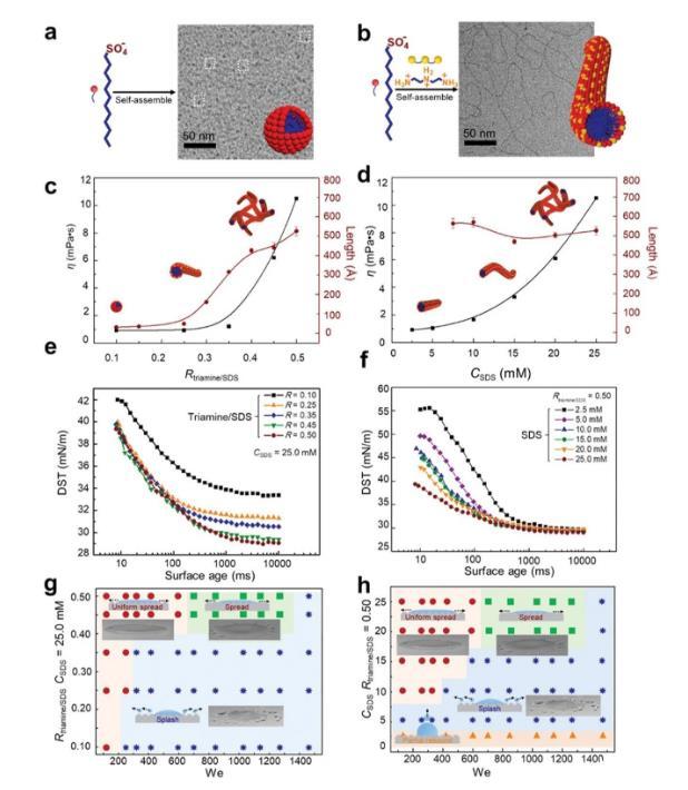 图2.撞击结果的物理化学性质和相图。a,b)SDS和三胺/SDS聚集状态的示意图和低温透射电镜图像。a)单独的SDS形成小的球形胶束,用虚线矩形突出显示。b)加入三胺后,三胺/SDS形成长而密集的缠结线性胶束。c,d)在不同摩尔比R和摩尔浓度CSDS下三胺/SDS的粘度和聚集长度。在临界摩尔比或摩尔浓度之后,胶束伸长并缠结成网络结构,导致粘度急剧增加。e,f)不同R和CSDS下三胺/SDS的动态表面张力(DST)曲线。随着R和CSDS的增加,初始和平衡表面张力均显着降低。g,h)不同We数下三胺/SDS液滴撞击超疏水表面的动态行为相图。在高We下,含有三胺/SDS添加剂的液滴只有在特定的摩尔比(0.45–0.50)和特定的摩尔浓度(>20.0×10−3 m)下才能完全沉积在超疏水表面上。